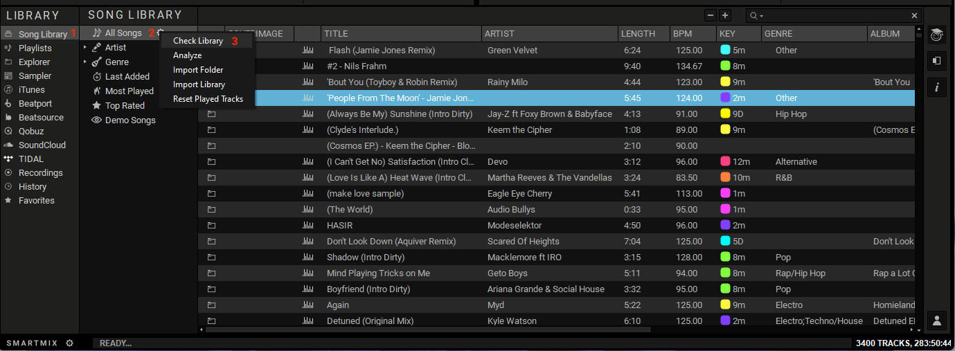GO into “Song Library” (1) => “All Songs” (2), click the gear button, and choose “Check Library” in the menu (3)