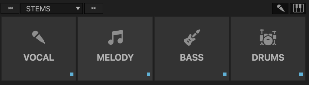 | PADS 1 – 4 | Press one of the 4 PADS to remove one of the 4 STEMS : Vocal – Melody – Bass – Drums |