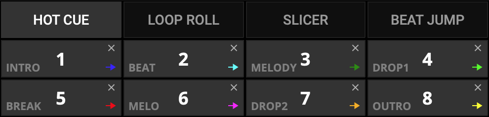 | PADS 1 – 8 | No Hot Cue has been set: Pressing a PAD assigns a Hot Cue to the current track position. A Hot Cue is already set: Pressing a PAD jumps the track position to the Hot Cue. Note: If a Loop was active when storing a Hot Cue, DJUCED creates automatically a Hot Cue Loop | Delete the assigned Hot cue on the selected Pad. |