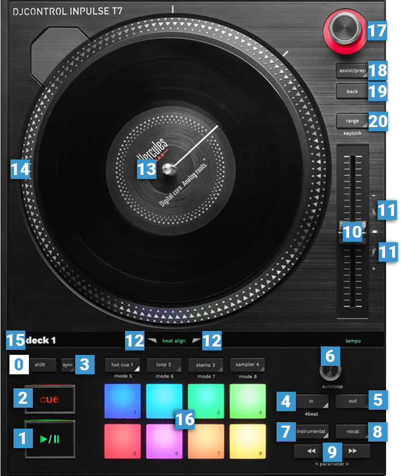 | 13 – Vinyl Disk | Touching and stopping the vinyl disk stops the playback, and resumes when released. Turning the wheel when touching the platter makes a scratch. | SHIFT + Disk : Seek into the song |