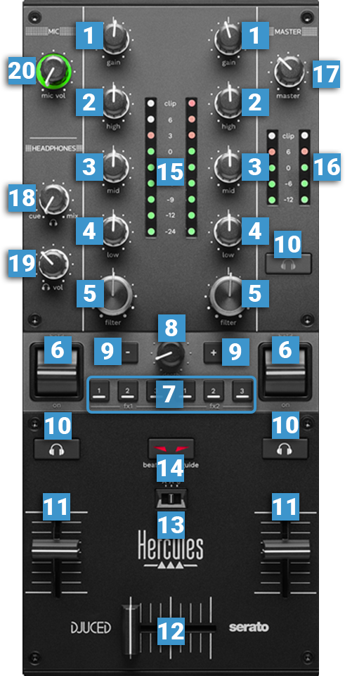 | 1 – Gain | Use this knob to adjust the pre-fader output level of the Left/Right deck. When the knob is at the middle/center position, the track will be at its original level. Tip: Adjust your gain level with the help of the Vu-Meter, the overall level should be around 0 dB. |
