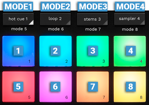 Press the MODE 1 button to set the Pads in Hot Cue mode. The Hot Cue mode is the default pads mode.