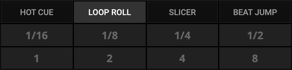 | MODE 2 – LOOP ROLL | Set Pads to Loop Roll mode and displays the Loop Roll on DJUCED interface. | Set Pads to MODE 6: PadFX (white led is blinking) |