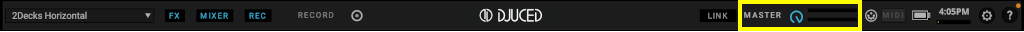Conseils: Si la carte son de votre contrôleur possède un contrôle de volume MASTER matériel, le contrôle de volume MASTER de DJUCED est désactivé.