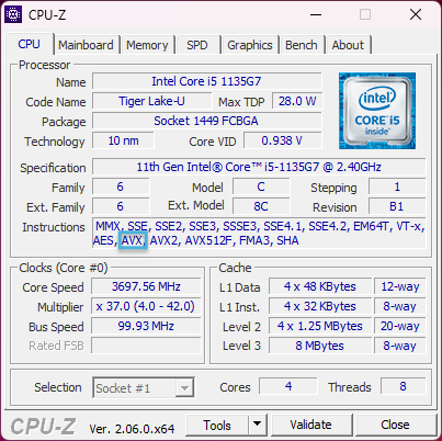 The best way to check AVX support is to use a third-party software, like the free CPU-Z.