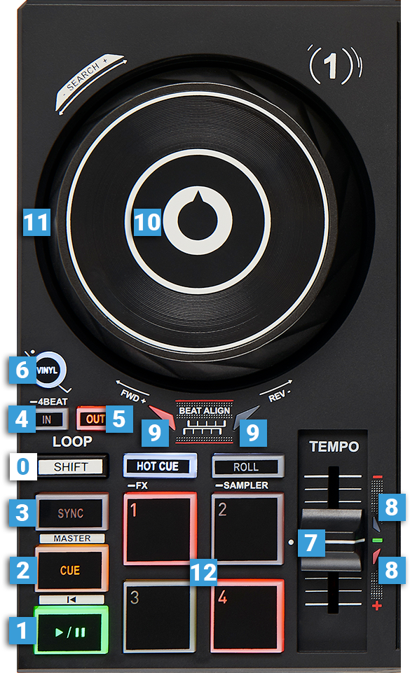 | 11 – Jogwheel Outer Ring | Use the Outer Ring to slow-down or speed-up the track you are playing. | Browses through the entire song. |