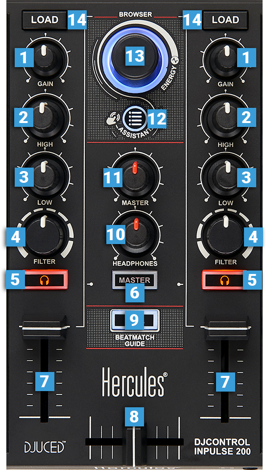 | 1 – Gain | Use this knob to adjust the pre-fader output level of the Left/Right deck. When the knob is at the middle/center position, the track will be at its original level. Tip: Adjust your gain level with the help of the Vu-Meter, the overall level should be around 0 dB. |