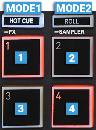 Press the MODE 1 button to set the Pads in Hot Cue mode. The Hot Cue mode is the default pads mode.