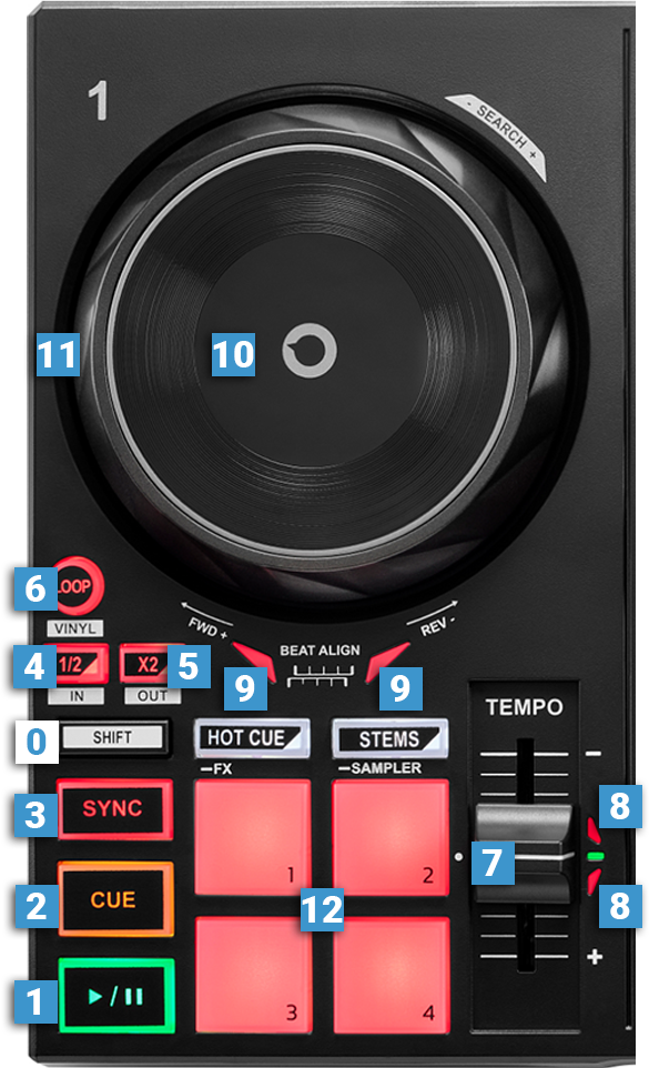 | 1 – Play | Play/Pause the current Loaded track. When paused, the Play Button Blinks at the BPM of the song playing in the other deck to help you start in rhythm. | |