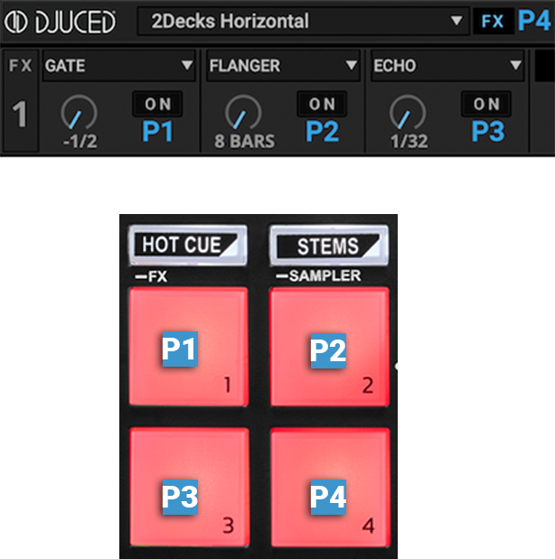 | MODE 1 – HOT CUE | Set Pads to Hot Cue mode and displays the Hot Cues on DJUCED interface. | Set Pads to MODE 3: PadFX (led is blinking) |
