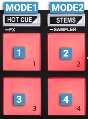 Press the MODE 1 button to set the Pads in Hot Cue mode. The Hot Cue mode is the default pads mode.