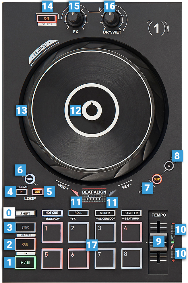 | 12 – Jogwheel Platter | When Vinyl mode is ON (default), touching the top platter stops the playback, and resumes when released. Turning the wheel when touching the platter makes a scratch. When Vinyl mode is OFF, turning the wheel acts like the Outer Ring. | Browses through the entire song. |