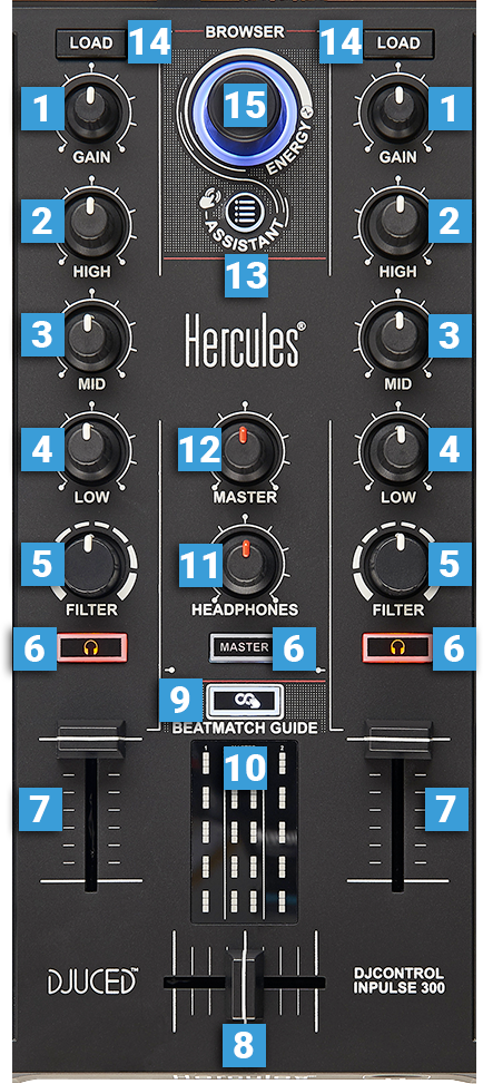 | 1 – Gain | Use this knob to adjust the pre-fader output level of the Left/Right deck. When the knob is at the middle/center position, the track will be at its original level. Tip: Adjust your gain level with the help of the Vu-Meter, the overall level should be around 0 dB. |