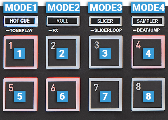 Press the MODE 1 button to set the Pads in Hot Cue mode. The Hot Cue mode is the default pads mode.