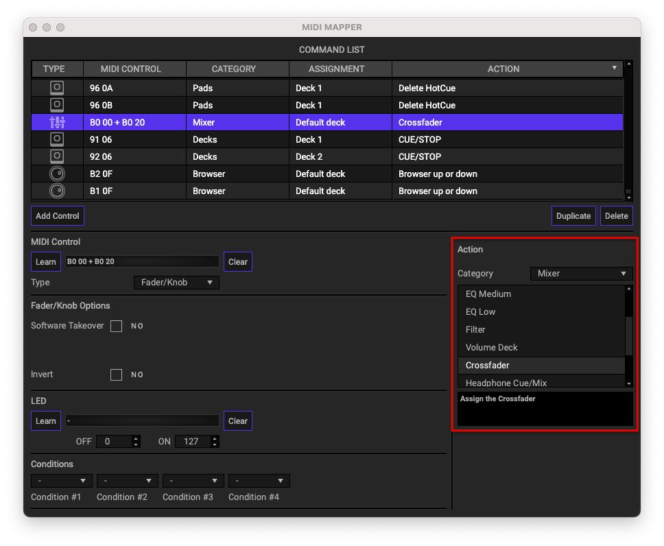 The Actions area allows you to assign an action to a MIDI Control. Actions are organised into categories and automatically filtered based on the selected MIDI Control type.