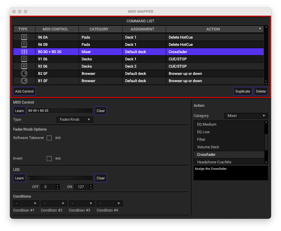 It is possible to sort this list by the type of controls, MIDI message noted in hex, action category, deck assignment, and action name.