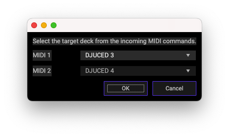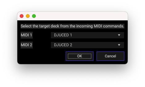 This pop-up windows appears and shows that the selected mapping is controlling DJUCED 1 and DJUCED 2 decks.