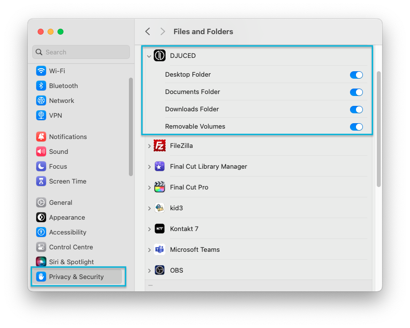 Check that DJUCED still got access to some folders, or use the Minus button to remove DJUCED from the list.