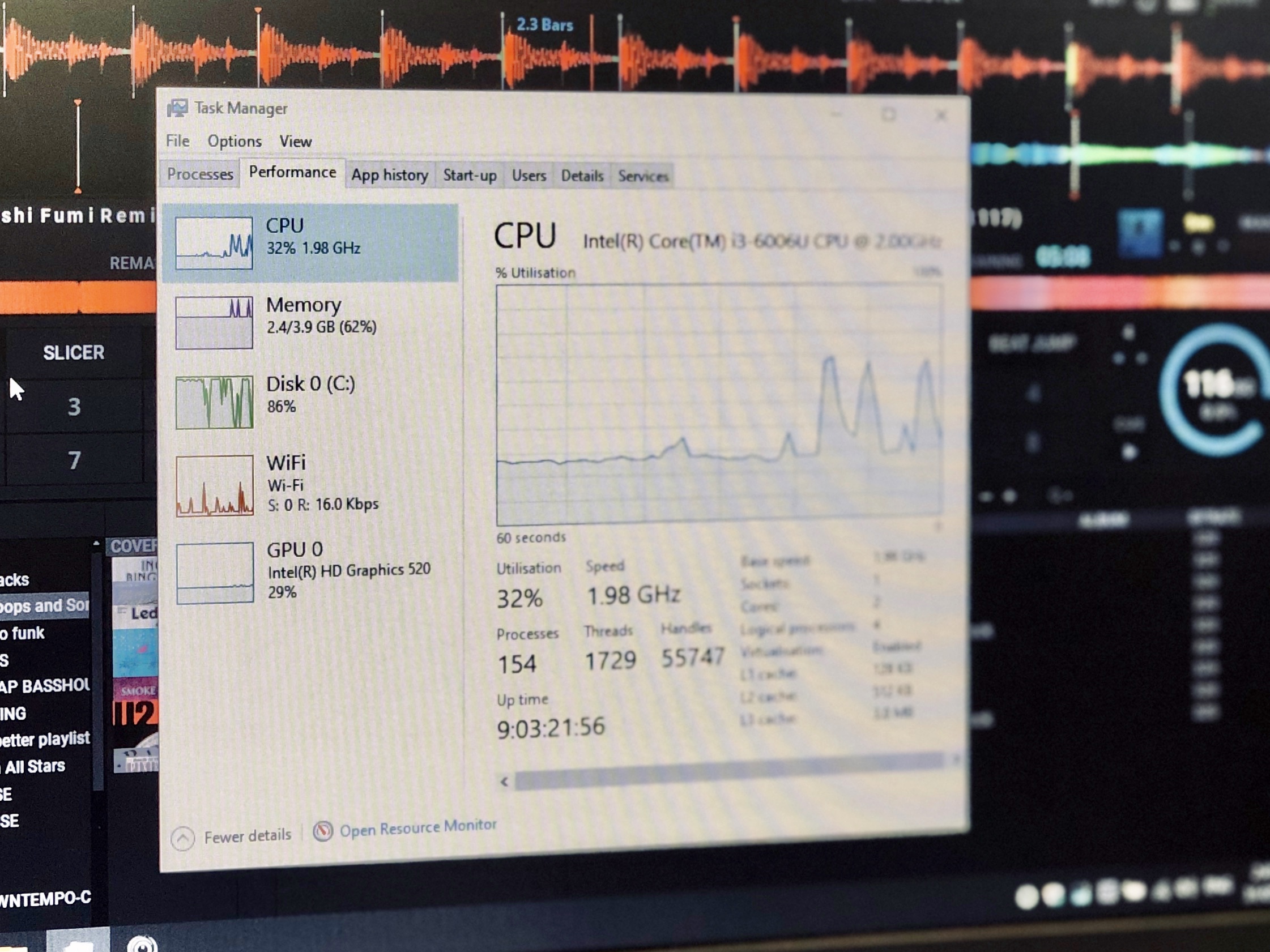 DJing on a computer is a realtime application. It takes a big part of your CPU to maintain a perfect audio signal.