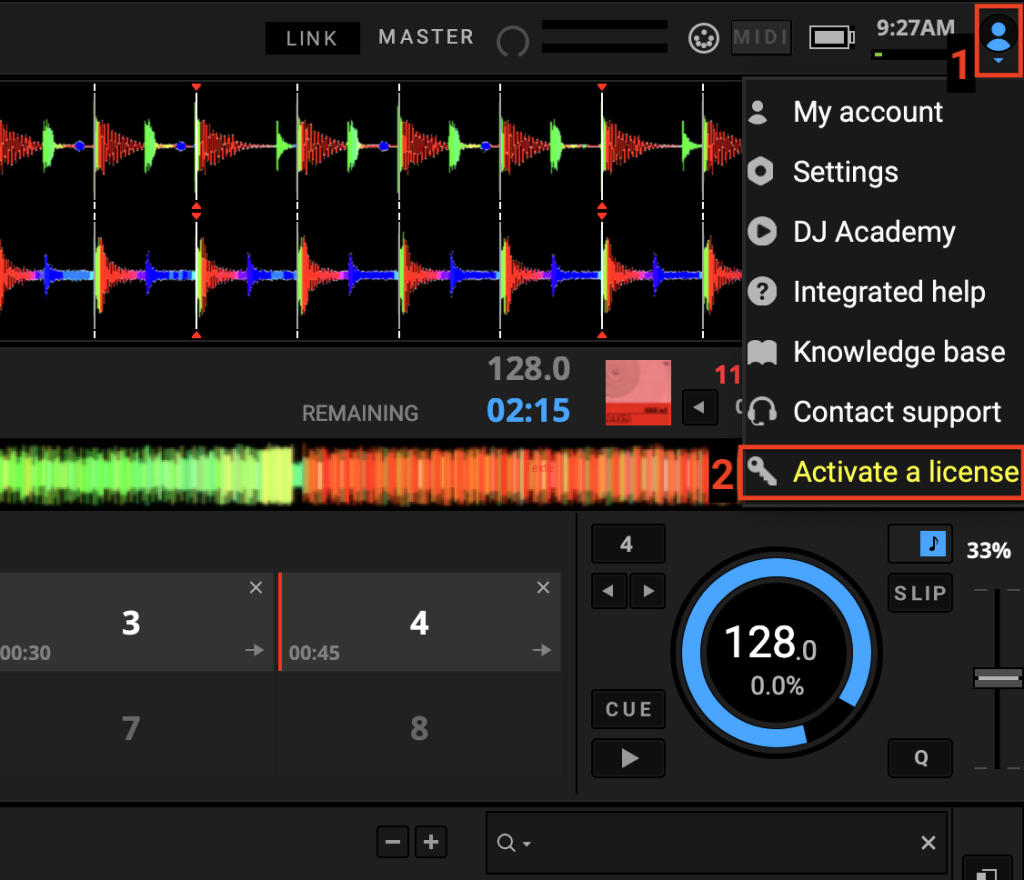 Open the user menu on the top right (1) and choose “Activate DJUCED Pro” button (2)