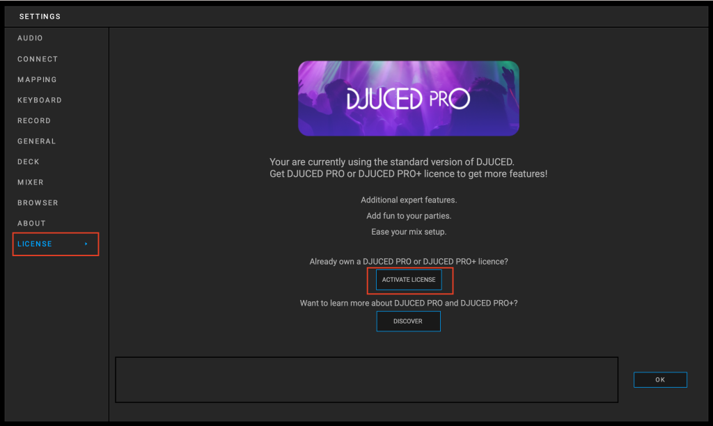 Inside DJUCED Settings, navigate to LICENSE tab.