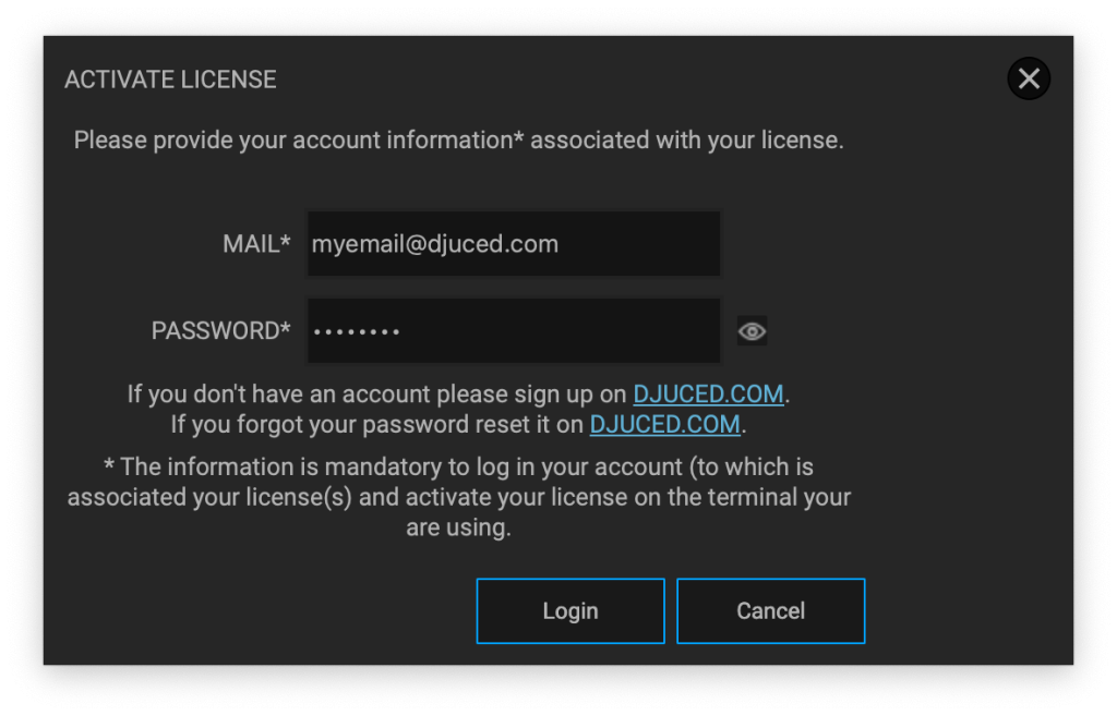 You need to enter the login details used to purchase or subscribe to DJUCED Pro/Pro+ within the DJUCED software.