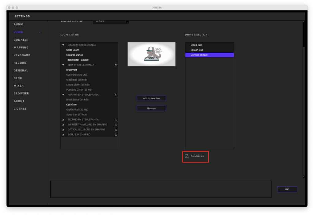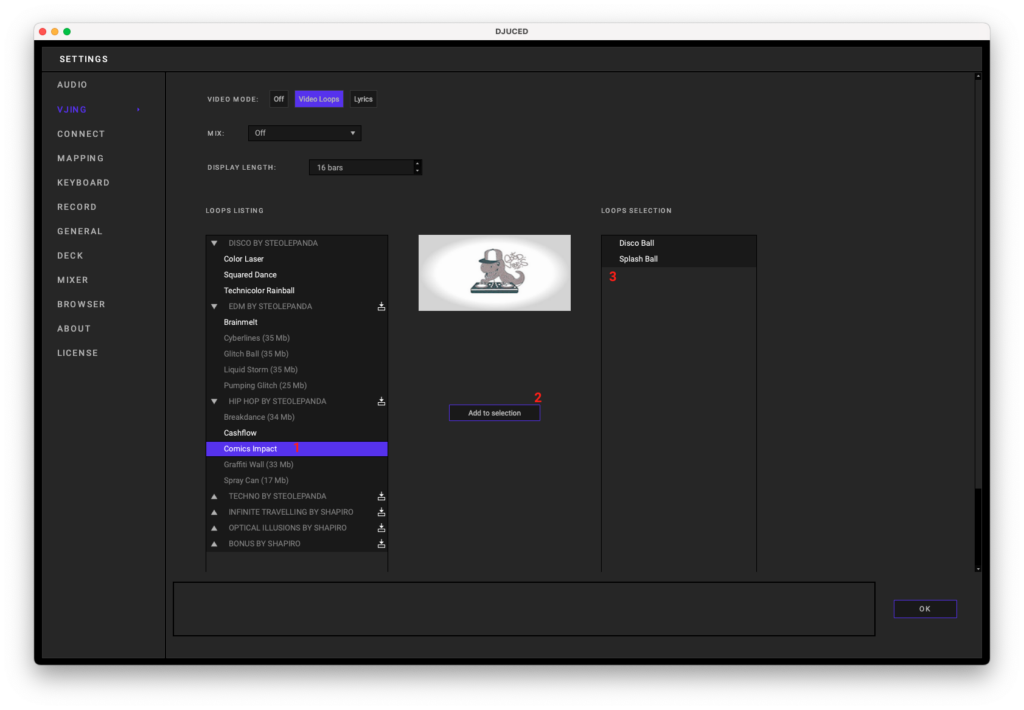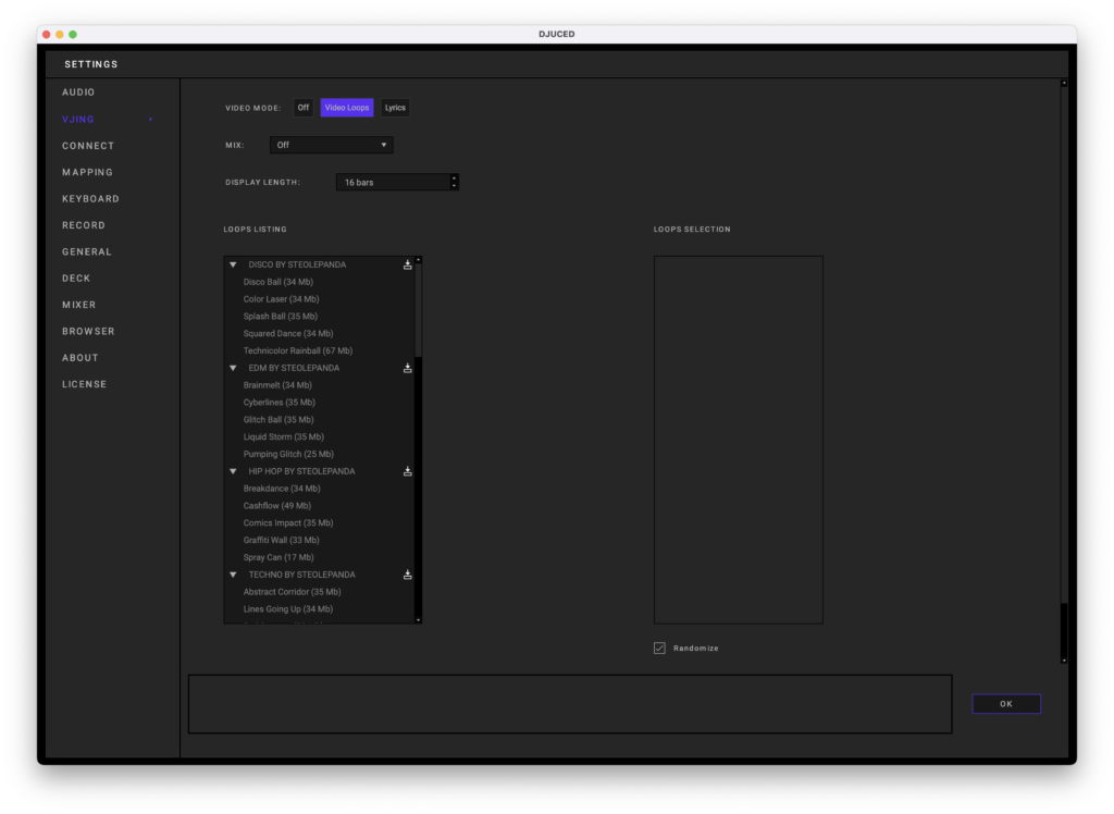 Loops listing is linked to DJUCED servers to propose you videos by theme.