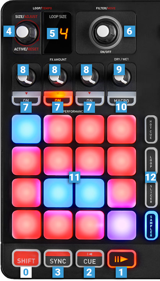 | PADS 9 – 16 LOOP | Press to create an Auto-Loop from 1/16 of a Beat (PAD 9) to 8 Beats (PAD 16) |