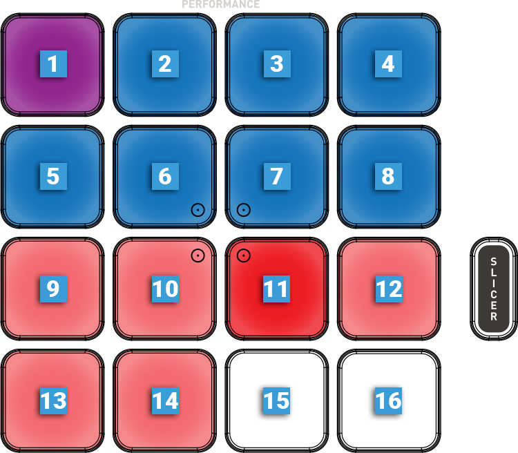 | PADS 9 – 14 | Press a pad to change the Slicer length from 1 Beat (PAD 9) to 32 Beats (PAD 14) |