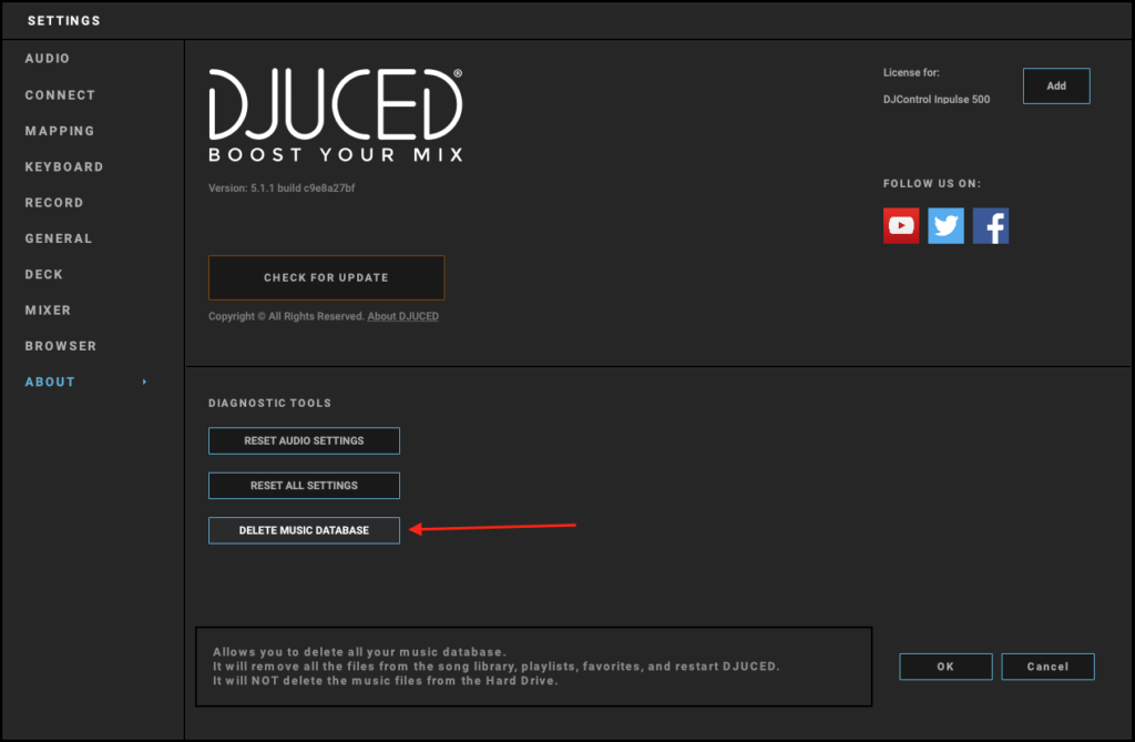 Go into DJUCED Settings => ABOUT => Click “Delete Audio Database” button.