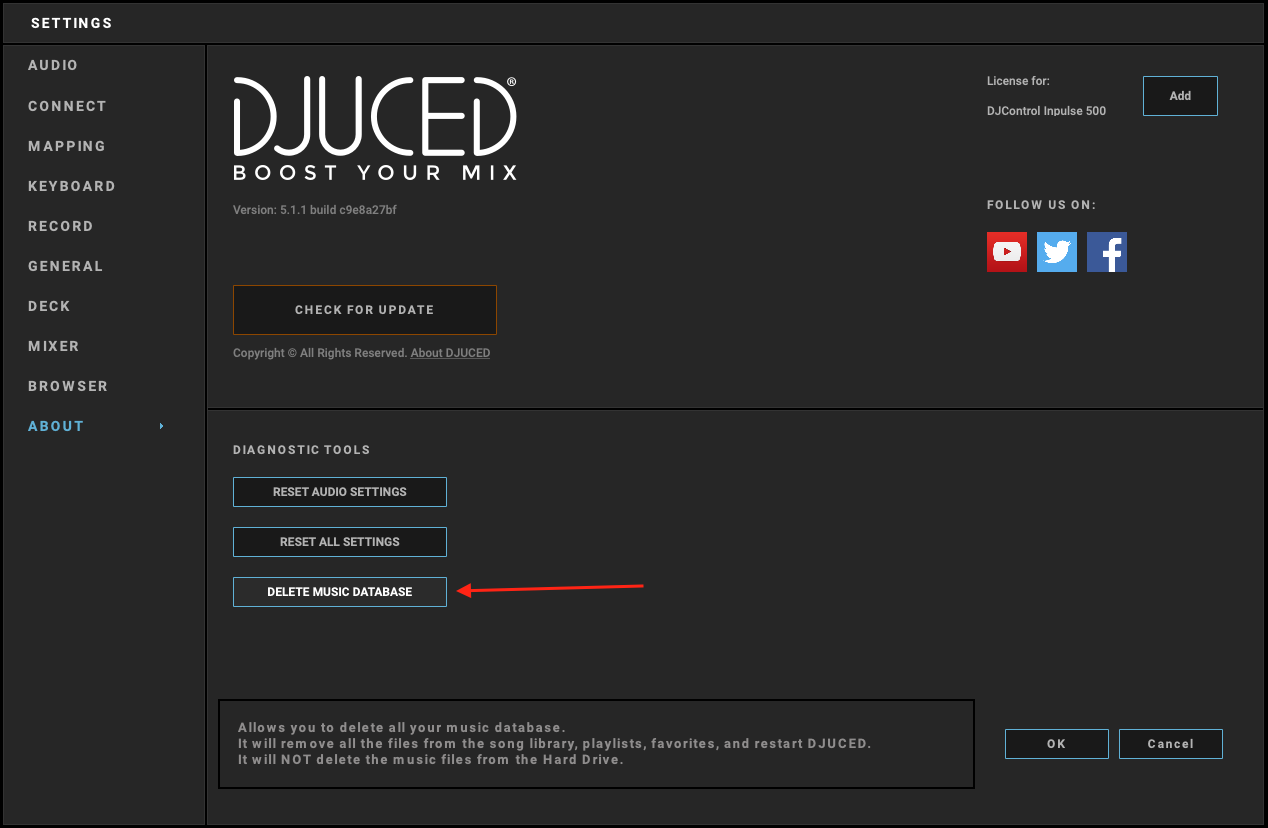 In the case that your library is not working properly, you can use the Diagnostic Tools in DJUCED to backup your Library, and reset to an empty one.